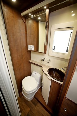 De nombreuses astuces rendent la vie à bord du Mc4 74 assez agréable. La double entrée dans le module de toilette est un vrai plus pour ne pas avoir à pénétrer dans la chambre lorsque l’on a besoin de se laver les mains. Le cabinet de toilette reçoit d’ailleurs une amélioration : la présence d’un rangement derrière le miroir. Ce dernier coulisse au besoin et vient en recouvrement de la fenêtre dépolie. Un bon point pour ceux qui aiment préserver leur intimité. Autre modification, dans le garage cette fois. La manivelle de relevage du lit est équipée d’un embout aimanté qui facilite sa mise en place et sa déconnexion.
