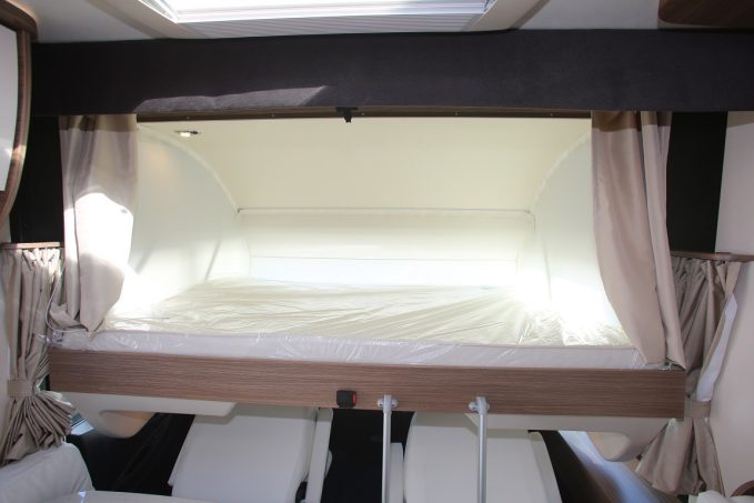 Le lit central est grand et confortable (190 x 140 cm). Sa hauteur variable permet d’ajuster le volume de la soute garage à vos besoins. Le matelas en Bultex repose sur un bon sommier à lattes. Parfait ! Le lit de pavillon (190 x 140 cm) se met en place facilement. Il est également composé d’une mousse Bultex et d’un sommier à lattes. La dînette peut, en option, être convertie en cinquième place couchage. Bien que le MB 700 soit court, il est équipé d’une belle salle d’eau à double compartiment : douche d’un côté et cabinet de toilette de l’autre.