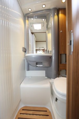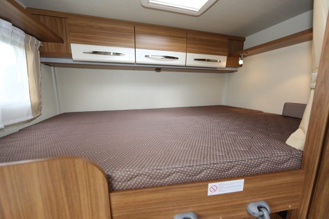 Les occupants de ce profilé profiteront d’un vaste lit double sur garage. Le matelas de 210 x 140 cm repose sur un bon sommier à lattes. Ce sera tout pour les couchages, le salon n’étant pas convertible en lit d’appoint supplémentaire. A noter, une astuce côté cabinet de toilette : une cloison pivotante permet de convertir l’espace sanitaire en vaste douche indépendante.