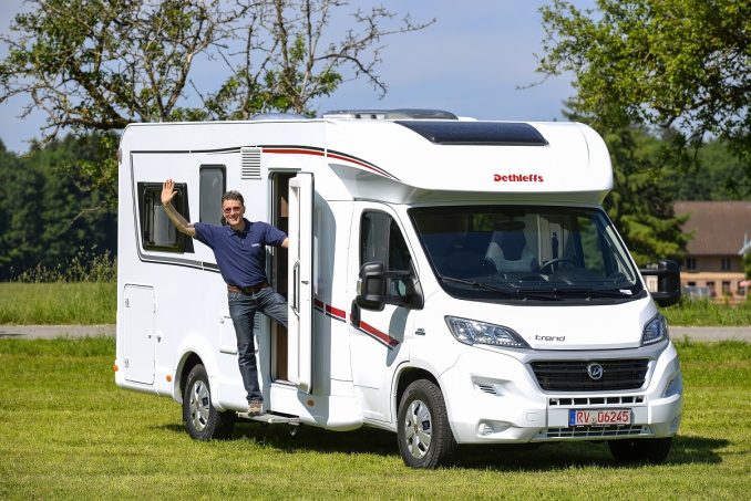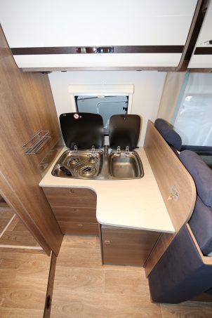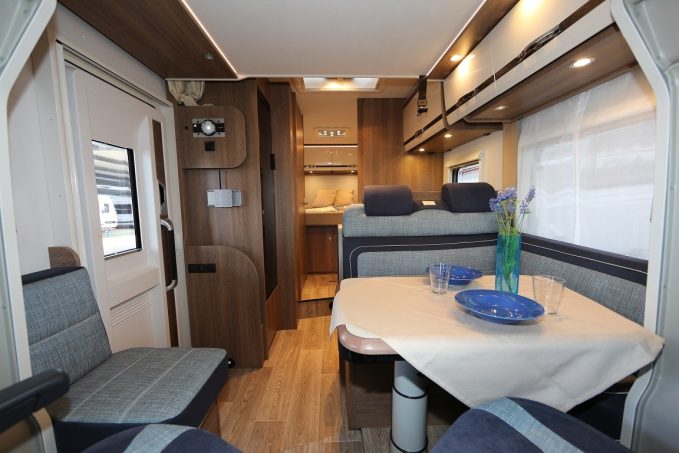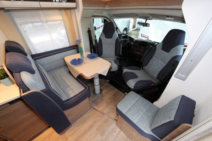 L'intérieur bénéficie d'un joli mobilier clair (chêne de Virginie) et d'une sellerie tissu biton bleu (Sporty). De nombreux rangements sont mis à disposition, notamment dans le plancher. Malheureusement, ceux situés dans la casquette avant ne se ferment pas. L'équipement de base comprend un grand réfrigérateur étroit (142 l avec le congélateur) et un combiné de chauffage puissant (6000 w) mais aussi la climatisation (manuelle), des stores plissés (Remis) en cabine, ou encore une porte d’entrée XXL (65 cm de large mesurés) dotée d'une moustiquaire et d'un marchepied électrique. Rétros électriques dégivrants, régulateur de vitesses et roues de 16 pouces améliorent le confort.