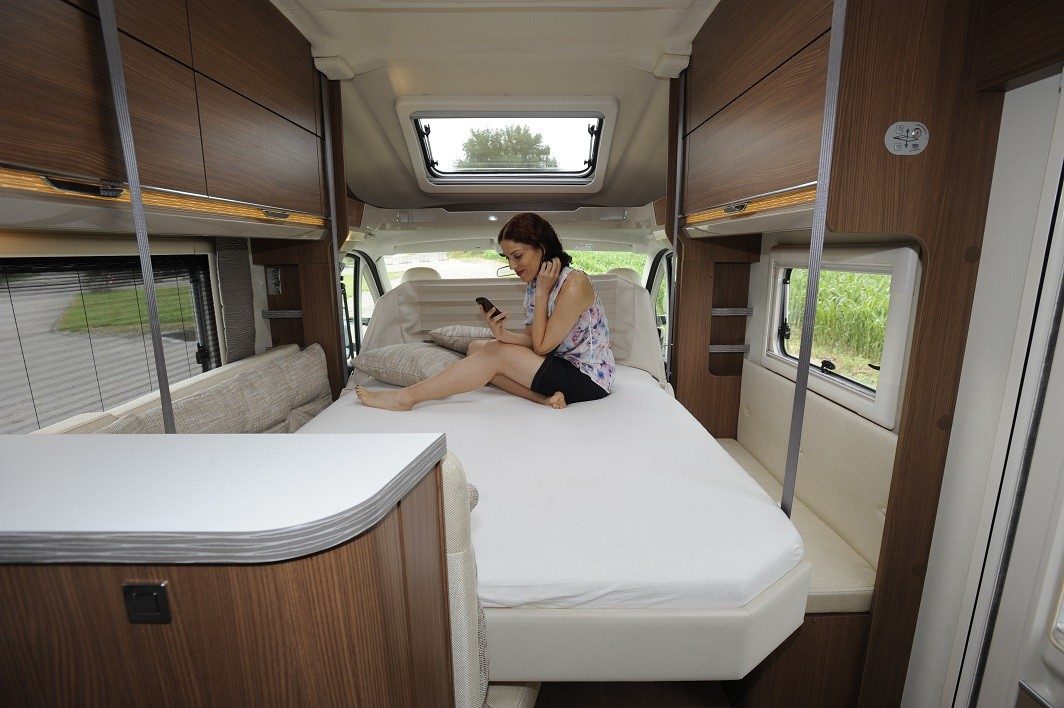 Pour la nuit, un nid douillet ce lit suspendu ? Oui. Le sommier est sur rotules articulées, le matelas en mousse coulée à froid à cinq zones de confort, les dimensions excellentes (200 x 137 cm) et son accès en pied, même s’il ne se fait pas sur toute la largeur, est très satisfaisant. Bien vu, le lit descend assez bas (75 cm du sol) pour y prendre place sans échelle. Le salon, lui-même, peut se convertir en lit double, mais ce n’est pas dans cette optique (4 places nuit) que l’Ixeo 680 séduit.