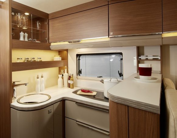 En quasi 7 m de long, il compose ainsi son agencement d’un super maxi salon (banquette en L + banquette latérale + sièges avant pivotants), d’une cuisine en U et d’un arrière entièrement dédié au cabinet de toilette et à un dressing. Voilà une bien belle proposition pour la partie jour, tout à fait inédite chez Bürstner.