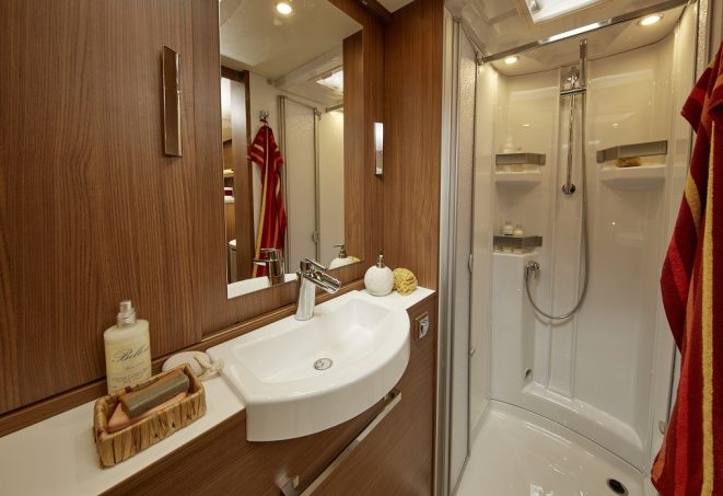 On apprécie notamment l’espace dédié au salon et la présence de placards hauts dans cette partie de la cellule puisque le lit de pavillon, positionné dans la longueur, préserve ces volumes de rangement. La disposition du bloc cuisine optimise aussi son usage. Et que dire de cette pièce sanitaire, avec cabine de douche séparée, si ce n’est qu’elle est idéale : derrière les portes miroirs se trouvent une immense penderie et une -tout aussi- volumineuse lingère.