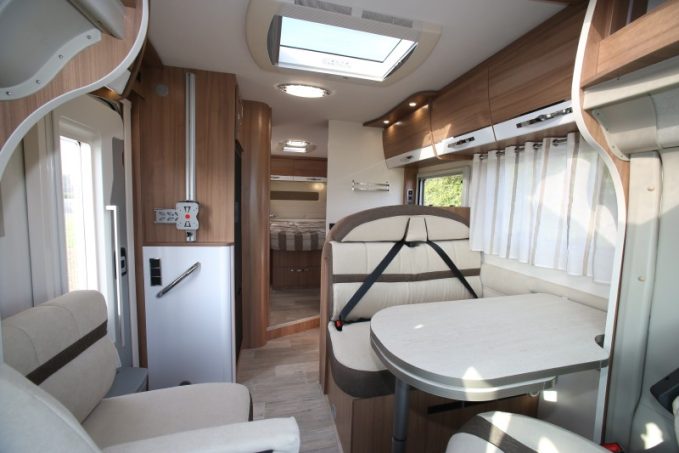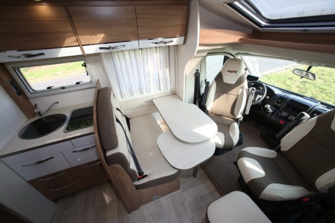 Le salon se pare d’une dînette droite face au siège conducteur. Une assise simple, à côté de l'entrée, permet d’envisager la présence d’un cinquième convive autour de la table équipée d'une rallonge pivotante bien pratique. Pour coucher un troisième passager, le 700 C ne disposant pas de lit de pavillon, vous n'avez droit qu'à l'option couchage d'appoint, après aménageant la dînette.