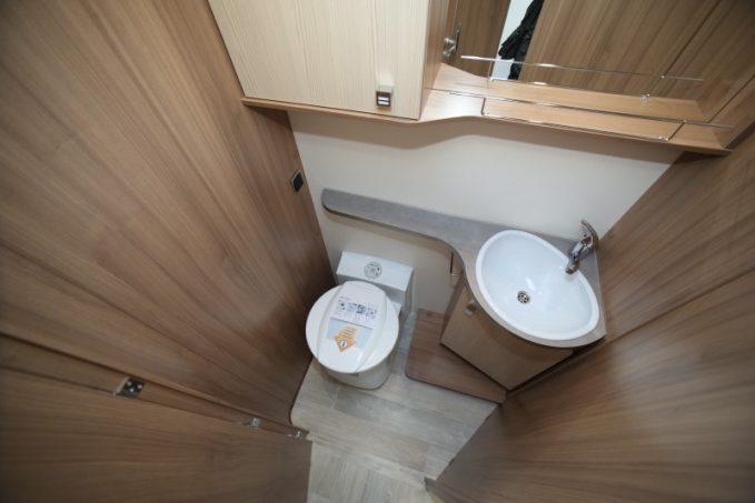 Dans ce profilé compact, les efforts de réduction de taille ont davantage porté sur l'espace accordé à la cuisine. Parée d’un réfrigérateur étroit Thetford nouvelle génération et d'un bloc droit, celle-ci ne dispose que qu'un réchaud et un évier rond en inox, mais cache un mini plan de travail extractible. Bien vu, tous les rangements à tiroirs sont munis d’un système Push-lock et d'amortisseur de course.