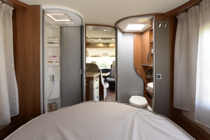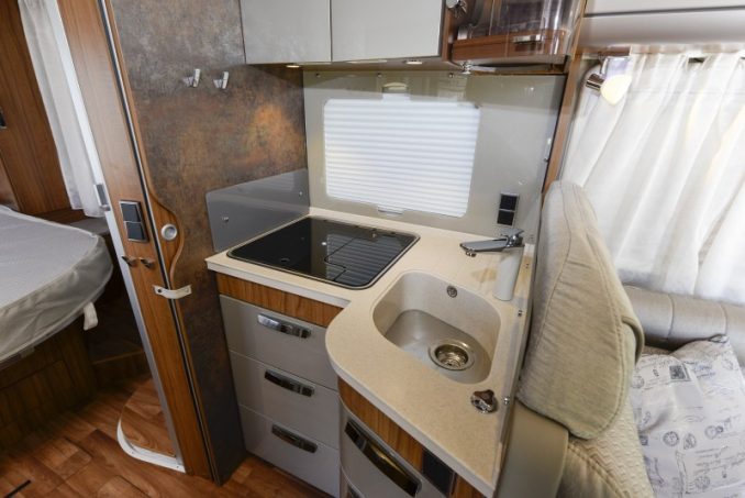 L'implantation du B-598 Premium Line permet de profiter d'une belle chambre à lit central sur garage (190/200 x 140 cm) avec sommier à tête relevable. Cabinet de toilette et douche, séparés, offrent un maximum d'espace. Pour conserver un salon accueillant, la cuisine a recours d'un côté à un réfrigérateur Thetford étroit, et de l'autre à un bloc de rangement en L Superbe et bien agencé, celui-ci comporte un emplacement spécial pour la machine à café, un réchaud à gaz trois feux, un mini plan de travail mais un petit évier.