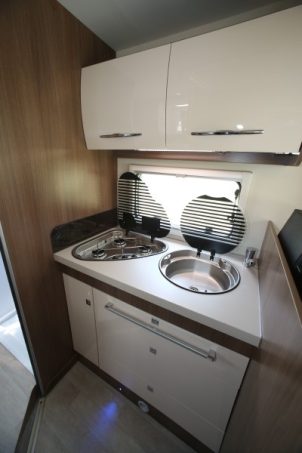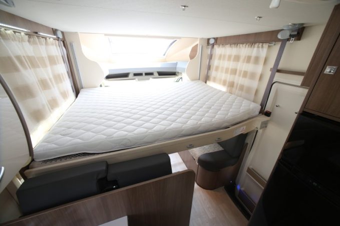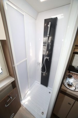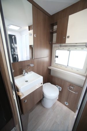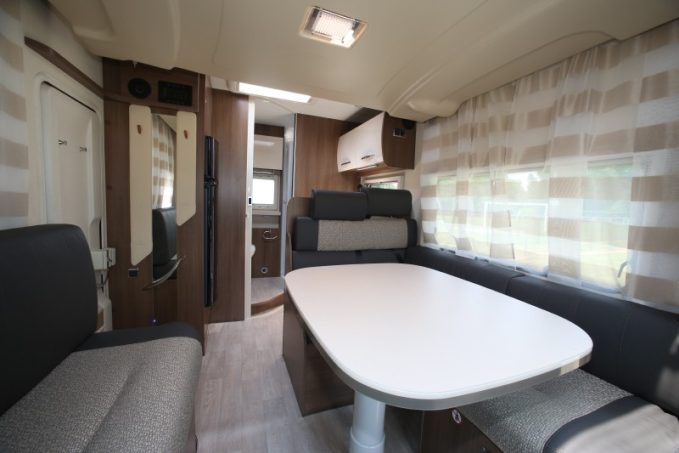 Présenté ici dans sa finition de base Genesis, le 190 reçoit un équipement déjà complet (lit de pavillon électrique, lanterneau panoramique, prises USB). Dotée d’un piétement télescopique, la table de salon sert au couchage d’appoint. Le lit principal est en pavillon, avec une charge maxi de 230 kg. La conversion de la dînette en lit biplace s'avère assez facile. Les coussins de la banquette se montrent justes un peu fermes. Vous apprécierez au quotidien l'espace dédié au cabinet de toilette (en fond de cellule) notamment au niveau de la douche.