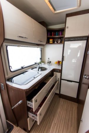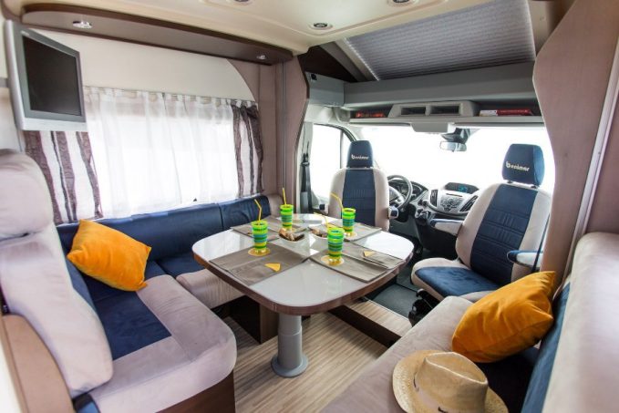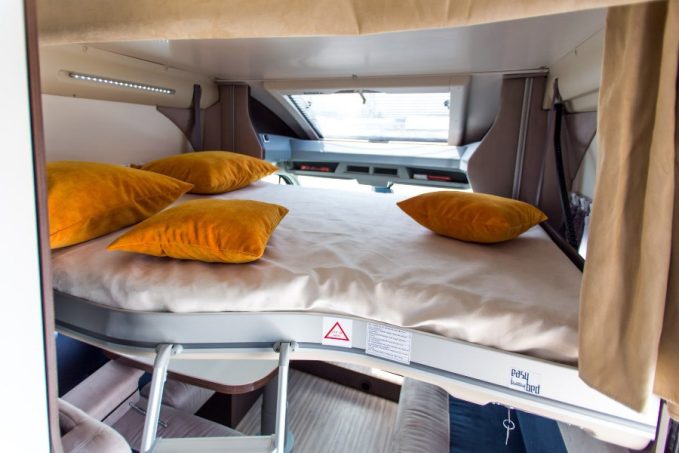 Le salon est donné pour six convives. Ce qui est vrai pour les assises l'est un peu moins en ce qui concerne la table. Son plateau carré conviendra plutôt à quatre couverts. Le lit principal se situe en pavillon, il affiche une très bonne capacité de charge maxi (230 kg). De son côté, la conversion de la dînette en couchage ne pose pas trop de problème. Les coussins de banquette se montrent simplement un tantinet fermes.
