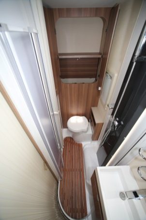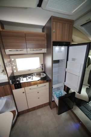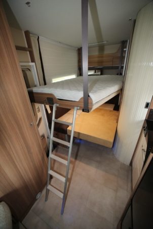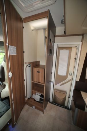 Plutôt bien équipé dans cette configuration Welcome (stores de cabine Remis, verrouillage centralisé, porte de cellule avec baie et moustiquaire, lanterneau avant panoramique Seitz, radars de recul, prise USB), ce modèle démontre à l'usage la praticité d’un fourgon avec un niveau de confort équivalent à celui d’un profilé. La douche, les WC et le cabinet de toilette, regroupés dans un seul volume, sont isolés par une porte rideau coulissante. Le lit permanent ressemble à un couchage ''à la française'' mais en version suspendue. Il descend du ciel grâce à un mécanisme électrique réglable en deux positions (intermédiaire ou basse). Sur la finition Welcome, Chausson vous laisse le choix entre trois mobiliers bitons différents (Marbella, Frassino, Rijeka).