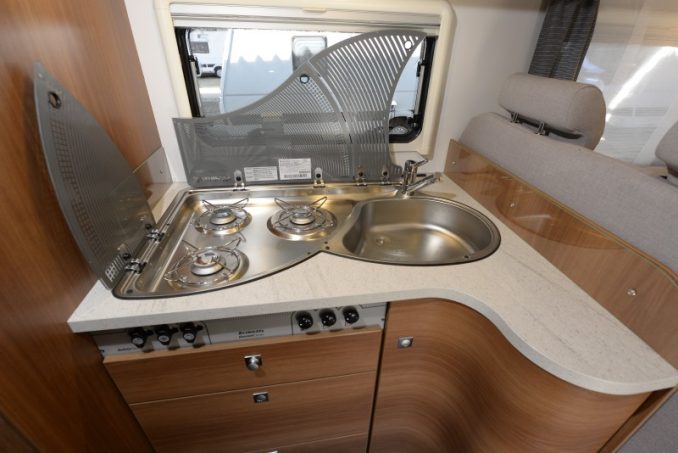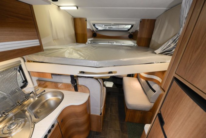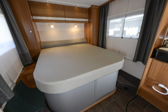 Avec ses 150 cm de large, les cotes du lit permanent sortent de l'ordinaire. De son côté, le lit de pavillon ne se montre pas invasif dans le poste de pilotage. Son matelas légèrement biseauté au pied permet en effet de rentrer ou sortir de la cellule sans problème même couchage abaissé. Cette série se démarque aussi par son chauffage puissant, secondé par le système Air Plus, cher à la parque allemande, qui améliore la circulation derrière les placards de pavillon. En partie arrière, vous apprécierez la rallonge de châssis surbaissée de 15 mm, optimisant la capacité de la soute. Celle-ci est desservie par deux grands portillons.