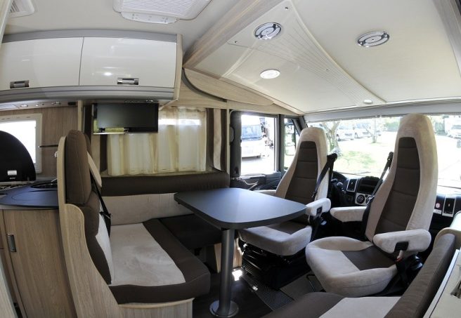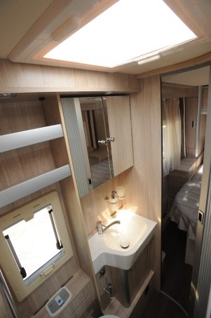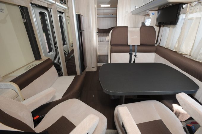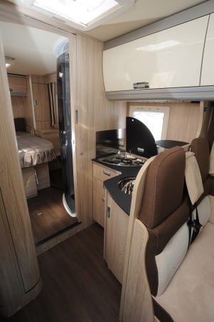 Les placards de pavillon, très bien dimensionnés, fournissent la capacité de rangement recherchée. La cuisine est splendide. Le plan de travail en résine, façon marbre noir, est d’une grande finesse. Les utilisateurs ne manqueront pas de volumes pour stocker casseroles, poêles et autres cocottes. Le support de télévision est dissimulé derrière un placard de pavillon. Il s’abaisse et se remonte comme un ascenseur. L’aération est assurée par la baie, la hotte aspirante de série et le toit dôme. Le performant Truma Combi 6 produit chauffage et eau chaude. Le garage modulable est accessible par deux portillons. La charge maximale autorisée s’élève à 220 kg.