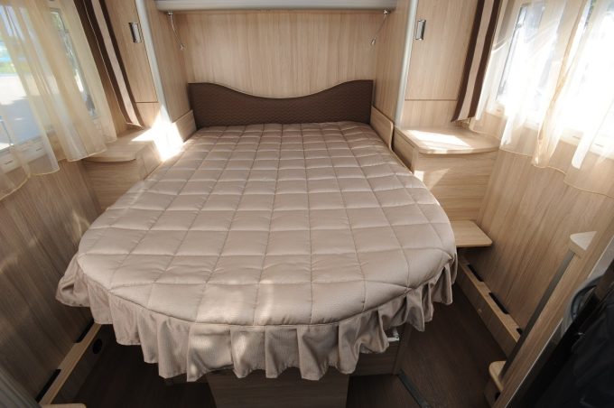 Dans la chambre, le lit central (190 x 142 cm) est facile d’accès. Sa hauteur est variable. La manœuvre se fait au moyen d’un interrupteur ; on module ainsi le volume de la soute-garage. Les éclairages à leds, sous différentes formes (spots et galons), diffusent une lumière directe et indirecte. Le lit de cabine (190 x 145 cm) s’abaisse en un tournemain. Le matelas en mousse (type Bultex) repose sur un sommier à lattes.