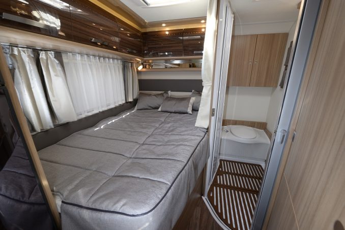 Le couchage à la française a toujours ses adeptes. Ce type de lit a le mérite d’être confortable et de pouvoir être installé dans une cellule courte. La salle d’eau n’est pas très grande, mais bien conçue. Une combinaison de portes en Plexiglas crée une cabine de douche. Remarquez le caillebottis qui recouvre le bac et qui permet de garder les pieds au sec quand on utilise les wc. Lesquels sont positionnés au fond du local.