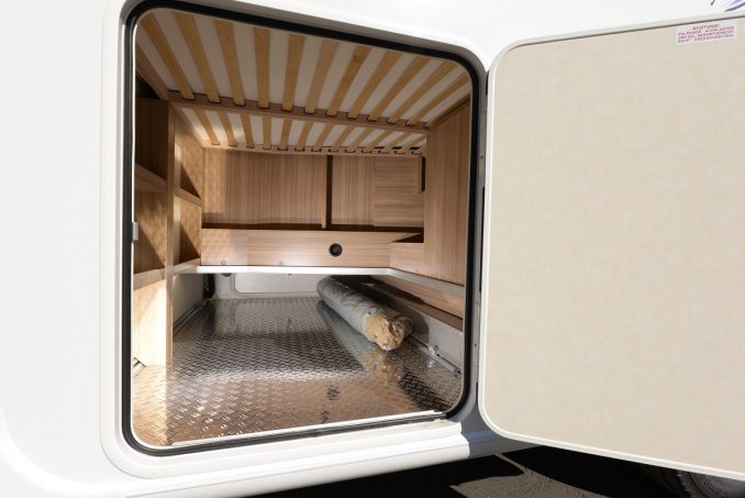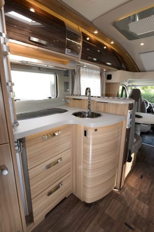 En cuisine, l’ergonomie du bloc principal est bien étudiée. Le réchaud trois feux en ligne est positionné dans le fond du plan de travail, laissant ainsi une grande surface utile pour préparer ou dresser les plats. De série, le réfrigérateur est un 108 l. Un plus grand volume est disponible en option (+ 846 €). La climatisation cabine est également en option. Chauffage et eau chaude sont fournis par le plus puissant des combinés Truma.