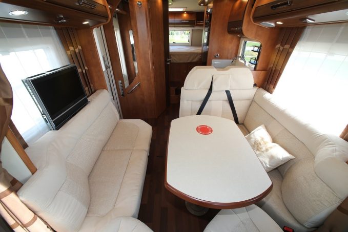 Ce modèle de moins de 7 m propose un salon capable de recevoir sans problème six convives autour de sa table centrale (tournant à 360°). Le T 145 H est équipé pour cela de deux banquettes (l'une en L, l'autre en long) qui n'obligent pas systématiquement à recourir aux sièges cabine.