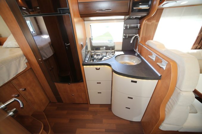 La planche de bord, agrémentée d'inserts imitation bois et acier, est parfaitement assortie au mobilier biton ainsi qu'à la sellerie claire Venezia (tissu Antara). Le coin cuisine n'est, en revanche, pas à la fête avec un bloc de rangements en L aux généreux en tiroirs, mais ne concédant qu'une petite place au plan de travail.