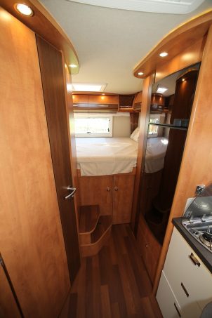Ce profilé est l'un des modèles les plus légers du marché (2780 kg). Sa technique de construction (parois alu et toit en polyester) lui confère également une excellente résistance aux intempéries (grêle, foudre). La charge utile s'en trouve améliorée sans avoir à sacrifier bagages ou équipements. L'option châssis Al-Ko permet aussi un gain en hauteur de 5 cm. Le réfrigérateur, repositionné plus haut, affiche une bonne contenance (160 l). L'écran plat de la TV a droit à un compartiment spécial intégré au dossier de la banquette. La salle d'eau combine au mieux douche, wc et lavabo.