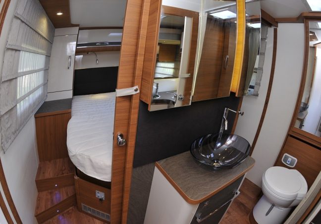 Passer dans la chambre oblige à contourner l’élément central intégrant le lavabo. Une paroi coulissante permet de transformer la salle d’eau en véritable sas entre le salon et la partie nuit. Un rideau souple en accordéon et une porte rigide à galandage isolent les wc. L’accès au lit central se fait en montant deux marches. La hauteur du couchage est variable, ce qui influe sur le volume du garage. Les personnes moins agiles opteront pour la position basse. Une fois allongée dans le lit, on se délectera de pouvoir regarder la télé installée sur la paroi opposée de la salle d’eau.