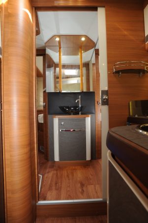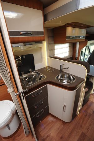 Le meuble de cuisine, avec son plan de travail couleur chocolat, est très bien étudié. Tiroirs et placards sont assez grands pour recevoir une belle batterie de cuisine et les denrées de premières nécessités. Une jolie crédence habille élégamment la paroi au-dessus du bloc. Elle est mise en valeur, en soirée, par un éclairage indirect à leds. Le réfrigérateur est un grand volume (150 litres) et permute automatiquement d’une énergie à l’autre.