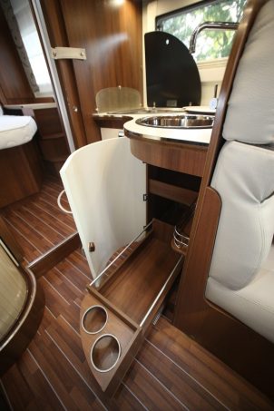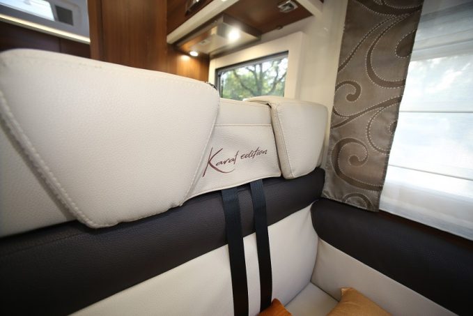 Le confort à bord du Karat Edition 62 est déjà visuel. La qualité perçue de cette série limitée est, en soi, synonyme de satisfaction et de bien-être. Ce n’est pas la suite de la visite qui va détromper cette première impression, puisque tout semble pratique et bien pensé comme cette porte double du cabinet de toilette qui évite de faire un détour par la chambre. La petite taille du 62 est juste un peu handicapante autour du lit, où il faut rétracter le sommier pour bénéficier d’une bonne voie de passage. Il convient aussi de noter que le lit de pavillon (électrique) ne peut accueillir qu’un adulte en raison de ses modestes 103 cm de largeur (190 cm en longueur).