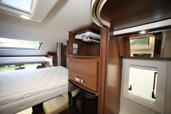 Malgré la faible profondeur de ce moins de 7 m, la chambre principale est sympa : deux grandes penderies et une splendide tête de lit molletonnée, barrée d’une grille chromée. Etant donné que le sommier se relève (manuellement), on apprécie les marches qui bordent le lit sur les côtés, car elles permettent une descente plus aisée lorsque le couchage est en position haute. De surcroît, elles renferment des rangements supplémentaires. Autre coquetterie, le sommier relevable au pied du lit s’articule en deux parties, le long de la ligne médiane, afin de sélectionner un accès distinct au coffre de rangement qu’il coiffe. Le lit central affiche par ailleurs des dimensions parfaites : 190 x 140 cm.