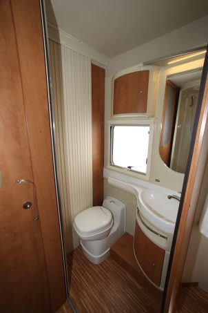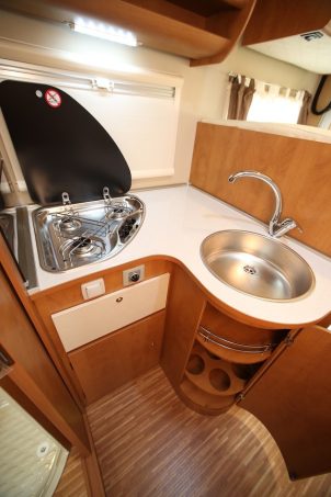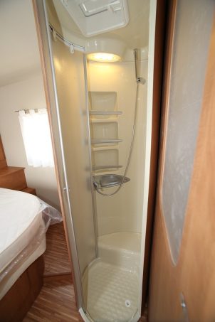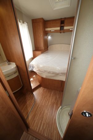 Côté nuit, on apprécie vraiment le réglage en hauteur du lit permanent (192 x 135 cm) bien que, depuis l’intérieur, la manivelle nécessite quelques contorsions pour être reliée au crochet du mécanisme. Le lit de pavillon (205 x 120 cm), quant à lui, monte et descend sans entrave, grâce à un mécanisme électrique bien secondé par les rails de guidage disposés sur les jambages du véhicule. Petit bémol, le lit ne descend pas très bas et ne libère donc pas un grand tirant d’air. En chambre permanente, soulignons positivement le bon accès au lit et la belle porte rigide coulissante, à baie dépolie, séparant le salon de l’espace nuit.