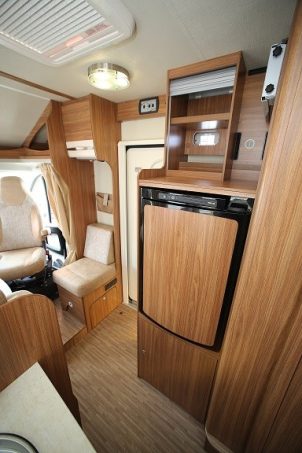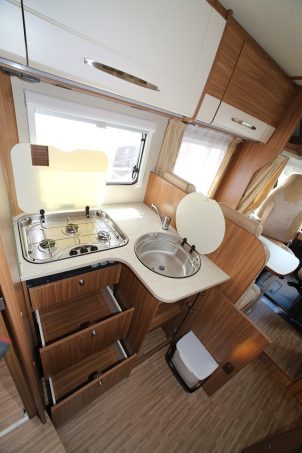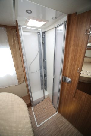 Le bloc-cuisine en L comporte de vastes tiroirs destinés à recevoir casseroles, poêles et denrées alimentaires. L’angle du meuble forme une belle surface de travail. La plaque de cuisson est assez grande pour faire chauffer trois petites casseroles en même temps. De série, le réfrigérateur est un 113 l, le grand modèle est en option pour un peu moins de 700 €… dommage. La salle d’eau, en deux compartiments distincts, se montre agréable à l’usage. Le système d’aération par lanterneau est efficace. La cabine de douche se clôt par deux portes en Plexiglas, que l’on peut manipuler une fois après avoir ôté la planche recouvrant le bac (laquelle planche sert à prolonger le plancher pour faciliter la circulation vers la chambre). Bonne note pour le puissant combiné chauffage et eau chaude Truma C6 !