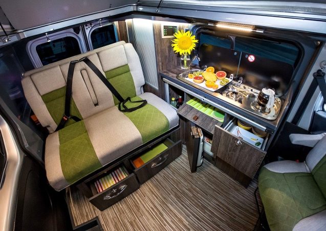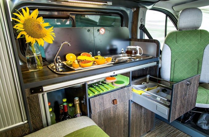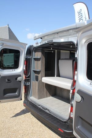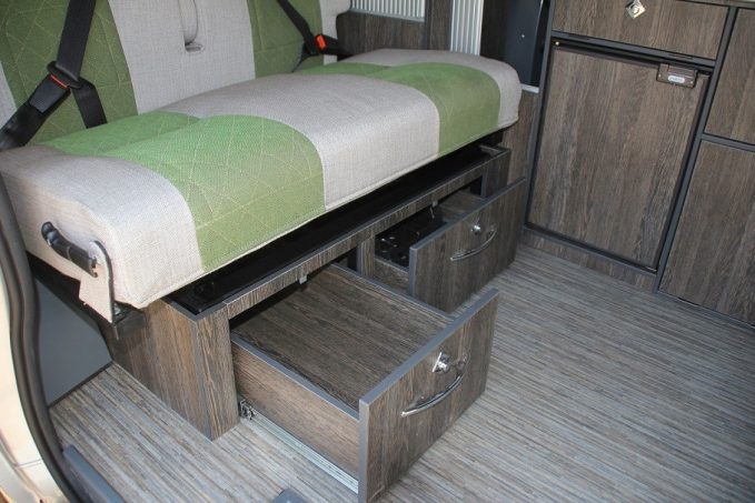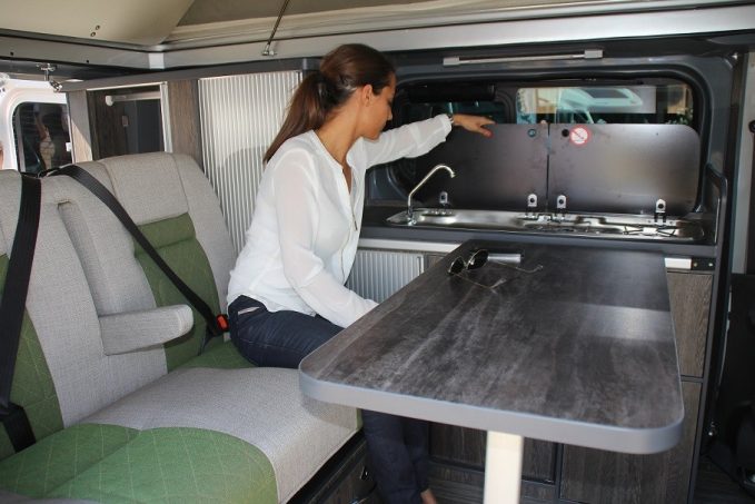 L'ensemble du mobilier s'appuie sur la paroi latérale gauche. A l'avant, le bloc-cuisine est surmonté d'un plan de travail intégrant des éléments affleurants, dissimulés par des plateaux de verre fumé (réchaud deux feux avec allumage piézo, évier avec robinet escamotable). A l'arrière, la penderie et la lingère occupent toute la hauteur du véhicule. Les portes coulissantes à lamelles permettent d'y accéder en toutes circonstances, quelle que soit la position de la banquette. Les rangements sont nombreux et bien répartis. On remarque, notamment, deux grands tiroirs utilisant parfaitement les volumes sous la banquette.