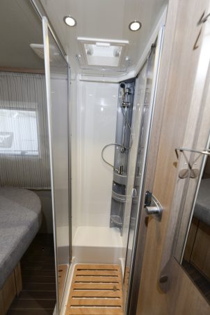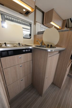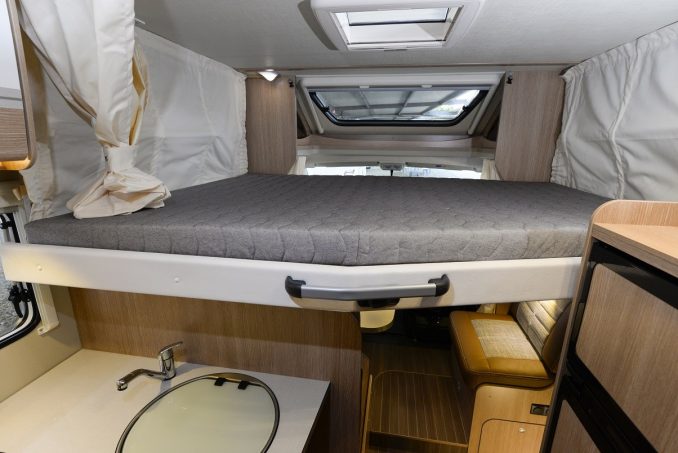 Le lit central est constitué d’un matelas de mousse à zones froides qui s’adapte à la morphologie des personnes. Les sommiers à lattes sont tout aussi efficaces. Le couchage surmonte une vaste soute-garage. Un deuxième couchage, en pavillon, est disponible en option (1399 €, présent sur nos photos). La salle d’eau est en deux parties indépendantes bien conçues (bonne aération) et assez spacieuses.