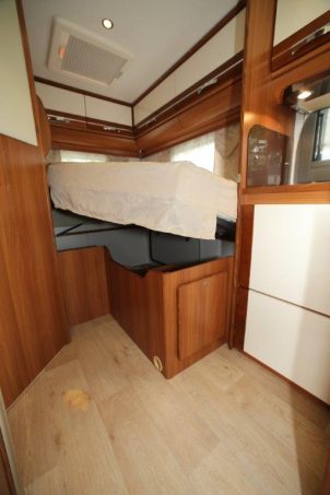Côté nuit, pas de lit de pavillon dans les profilés Fleurette. Le 63 LG propose un unique couchage permanent (188 x 130 cm) légèrement biseauté au pied, selon la formule classique de ce type de plan. Le lit est d’un bon confort, mais pas très large pour autant. En complément, on trouve aussi un couchage convertible dans le salon. Côté salle d’eau, la cabine de douche reste séparée du reste de la pièce par des parois translucides repliables.