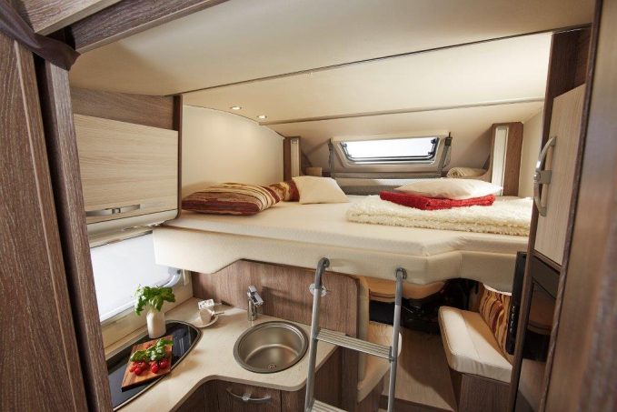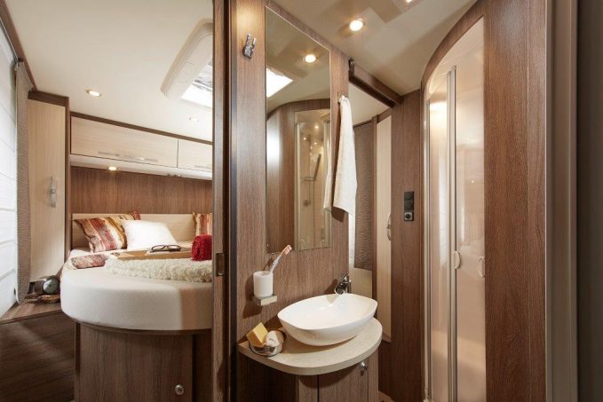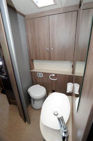 Côté nuit, un lit pas tout à fait central de 195 x 145 cm (marche coté droit), une salle d’eau faisant sas, ample, en trois “secteurs” modulables à volonté, un matelas de très belle qualité avec lattes sur rotules et housse lavable anti-allergène… les fonctions nuit et salle d’eau sont parfaitement maîtrisées.