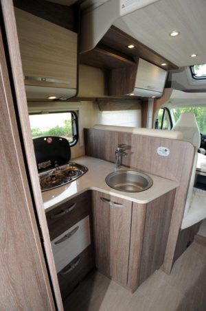 Maxi-salon en L, cuisine en L, lavabo et lit au centre, à l’arrière. Le tout en 7,49 m de longueur extérieure hors tout, ce qui laisse pas mal de place pour qu’on puisse circuler commodément à l’intérieur de cet Ixeo Time it 745. Le séjour emporte l’adhésion immédiatement, tant il est cohérent dans ses dimensions et accueillant (très confortables assises). La grande table peut l’être encore un peu plus, grâce à une rallonge pivotante. Attention à la marche tout de même : la dînette est posée sur une estrade (sous laquelle se trouve la réserve d’eau).