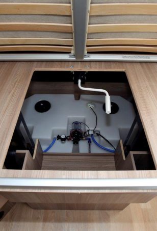 Grâce au système de réglage en hauteur du lit permanent (+ 28 cm), une soute-garage gagne du volume en quelques tours de manivelle (la démultiplication est parfaitement étudiée). Des soufflets en tissus assurent un minimum d'étanchéité sur les côtés du lit. En position haute, le matelas culmine à 94 cm du plancher, et aucune marche n’est prévue sur les côtés. L'accès à la soute, lui, peut s'effectuer par la droite (portillon de 62 x 102 cm), comme par la gauche (portillon de 62 x 77 cm) du camping-car. Son chargement ne doit pas excéder les 150 kg. Une fois le lit monté au plus haut, glisser un vélo dans la soute paraît possible. Six crochets d'arrimages sont d’ailleurs présents.