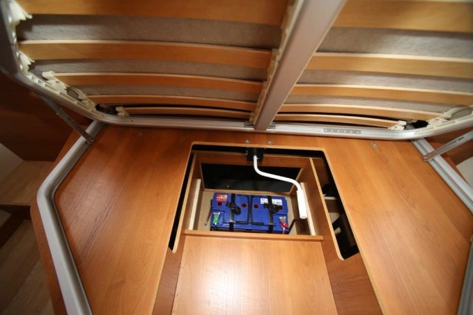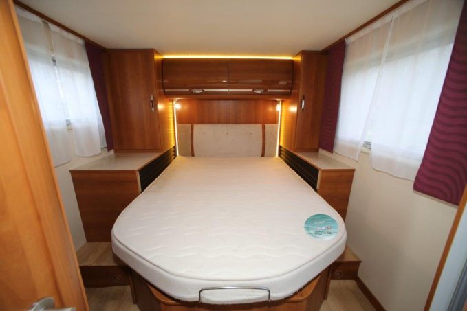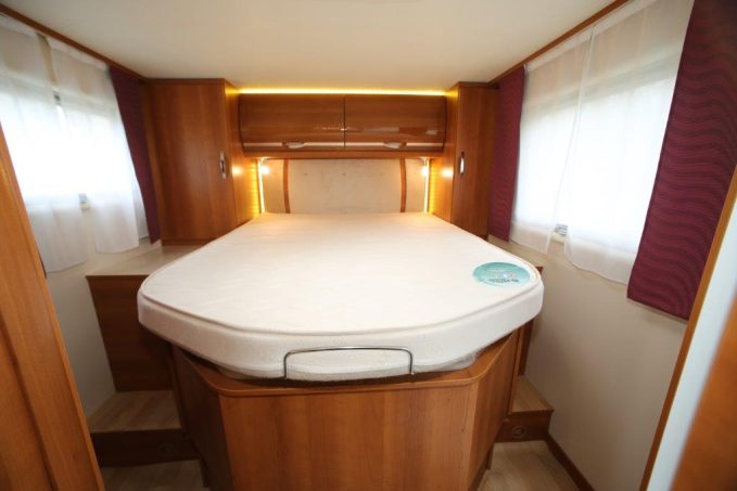 Il fallait toutefois que le 891 F Design Edition se distingue vraiment du 891 F de base. Rapido installe ainsi, sous le lit permanent, un dispositif qui permet d’en faire varier la hauteur (avec une trentaine de centimètres de débattement) et de modifier le volume de la soute pour la transformer en garage. Des soufflets latéraux assurent l’étanchéité entre la soute et le garage. C’est ingénieux mais on regrette néanmoins que la manœuvre ne soit pas motorisée. Descente et montée se font donc avec une bonne dose d’huile de coude. Le confort des couchages est excellent, garanti par des matelas Bultex et des sommiers à lattes.