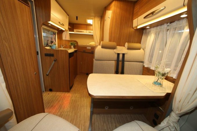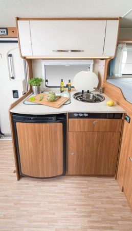Le T 132 profite aussi du même mobilier que ses “frères” ainés. L’ambiance est lumineuse et agréable. Pour le chauffage, Carado a opté pour le puissant combiné Truma 6 qui mettra très rapidement à bonne température le volume restreint de l’habitacle. La cuisine ne manque de rien. Certes, il ne faut pas s’attendre à y trouver un grand réfrigérateur, faute de place, mais le modèle de 113 litres, installé sous le plan de cuisson, satisfera certainement les occupants. Une deuxième penderie est logée sous le lit permanent.