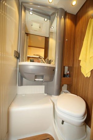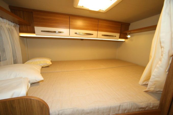 Pas facile d’installer une salle d’eau à douche séparée dans une cellule aussi courte que celle du T 132. Carado use donc d’une astuce : il utilise un compartiment qui se transforme, à l’envi, en cabinet de toilette ou en cabine de douche en faisant pivoter une cloison PVC. Le lit permanent offre un excellent confort. Le matelas, en mousse à zone froide, s’adapte idéalement à la morphologie des personnes. Le sommier est constitué de lattes. La dînette se convertit en troisième place couchage, si tant est que l’option banquette latérale ait été choisie.