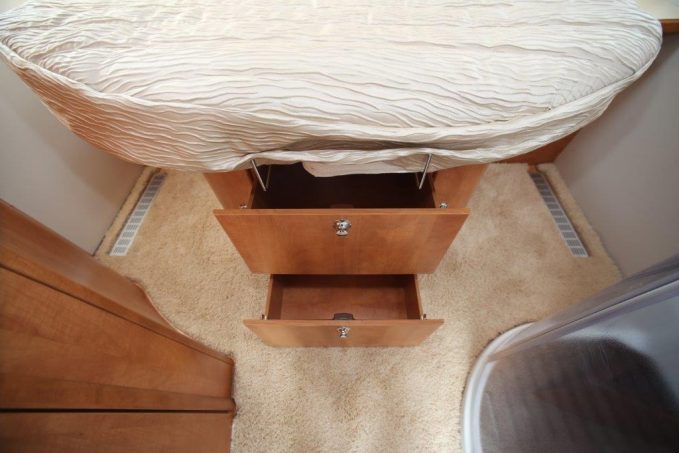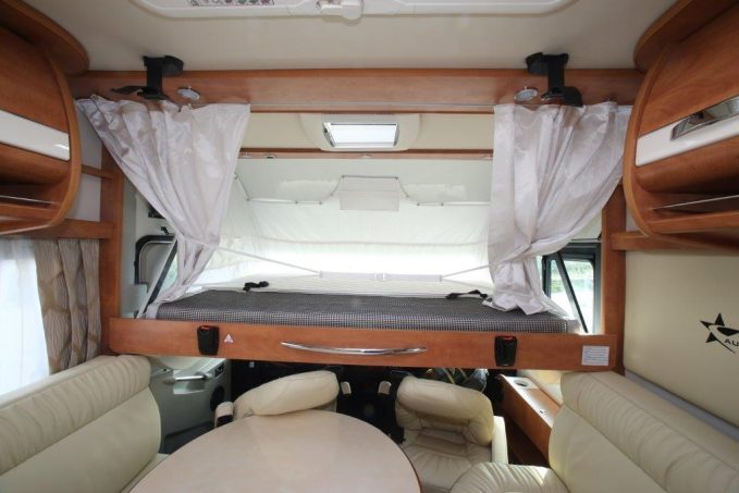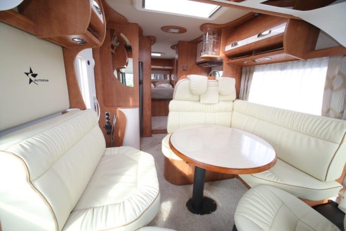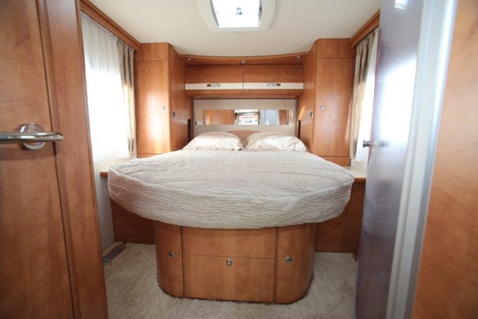 L’organisation intérieure avec lit central arrière (190 x 140 cm) est classique, le niveau d’équipement complet : chauffage central Alde avec échangeur thermique + résistances électriques 1000 W et 2000 W ; sécurité gaz pour que le chauffage fonctionne en roulant ; cuves hors gel, chauffée pour eaux grises ; vanne de vidange électrique ; réfrigérateur de 170 litres AES avec conservateur séparé ; station multimédia CD MP3 ; caméra de recul ; projecteurs antibrouillard ; feux de jour ; compartiment pour 2e cassette wc (fournie) ; deux enrouleurs dans la soute (tuyau d’eau propre et rallonge électrique) ; matelas de 15 cm d’épaisseur à mémoire de forme… Notez néanmoins que le modèle ici testé comprend aussi quelques options, comme le cuir Vanille (1998 €) ou encore la moquette surjetée.