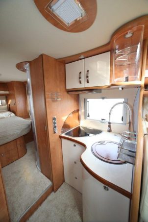 Reste à évoquer la construction et, partant, la possible valeur à la revente du Prestige. La base est un hybride de Fiat Ducato et de châssis Al-Ko abaissé à voie large et roues arrière semi-indépendantes, le top en tenue de route. La cellule est de type double-plancher. Elle est faite de panneaux sandwich à âme isolante en Styrofoam, quasi exempts de ponts thermiques, et dont les faces exposées sont revêtues de polyester ; cela vaut pour le sous-plancher. La face avant polyester, validée en soufflerie, fait économiser 1 litre de carburant aux 100 km (par rapport aux intégraux antérieurs). Son isolation phonique est meilleure qu’auparavant. L’inclinaison de la plage avant améliore la visibilité à l’aplomb du pare-brise. Quant au mobilier, en décor Merisier à aplats Ivoire, on voit de suite qu’il est de confection maison.