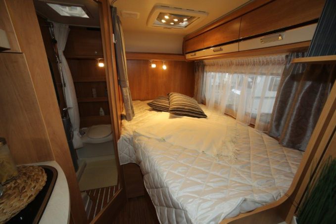 Sous le bloc-cuisine de ce camping-car, se glisse le réfrigérateur de 104 l. Cette capacité peut sembler insuffisante mais, dans le cadre d’un usage à deux, considérons que cela suffit. Pour ce qui est des équipements, par ailleurs, il est bien évident que le Truma Combi 6 chauffe rapidement le volume réduit de la cellule. Côté chambre, le lit « à la française » offre un bon confort à deux adultes. Le matelas, confectionné dans une mousse haute densité, repose sur un sommier à lattes de grande qualité. Dans la salle d’eau, la douche est séparée du coin toilette par un simple rideau en Nylon. Un jeu de portes en Plexiglas aurait été préférable.