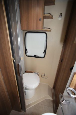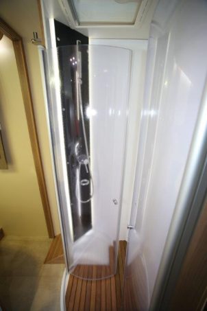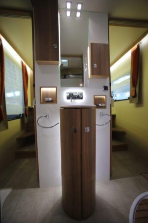 La partie nuit, qui fait la saveur du 388 B, concentre toutes les attentions. Plus que le lit central rehaussable, les penderies latérales, les coffres dans les marches d’accès auxquels nous sommes habitués, nous retiendrons plutôt les prises TV au plafond au sommet de la paroi de séparation, tellement pratiques pour l’installation de l’écran plat. Mais il va sans dire que l’essentiel du sujet concerne la salle d’eau transversale. Reconnaissons qu’elle est bien conçue avec ses deux portes coulissantes s’effaçant à l’intérieur de la double paroi de séparation, sa vaste douche à double bonde, et son wc séparé.
