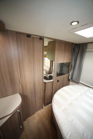 Le 840 F a quelque chose que son ainé de profilé ne possède pas : un grand lit de pavillon. C’est important, car la capacité de couchage passe de deux à quatre. En place, le lit de pavillon laisse libre l’accès à la dînette. La position du lit permanent, ni central, ni à la française permet d’installer le compartiment toilette en bout arrière de la cellule. Il se transforme en cabine de douche par un jeu de cloisons articulées en Plexiglas.