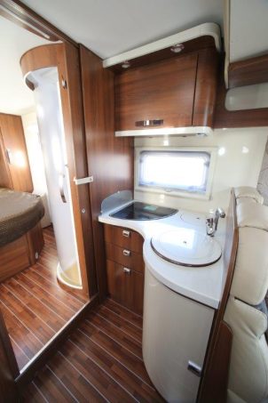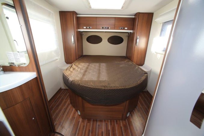 En cuisine, le mariage des teintes crème et bois est, là encore, réussi. Face au bloc, le réfrigérateur AES de 150 litres est surmonté de deux placards. Celui du haut enferme un support pour l’écran de télévision. Côté chambre, on circule aisément au tour du lit central (142,5 x 190 cm). La tête de lit est décorée de deux coussinets, et chacun dispose par ailleurs de son spot de lecture et d’une profonde penderie.