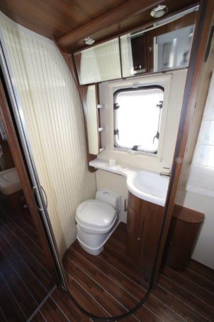 Le cabinet de toilette, assez vaste, se ferme par une porte coulissante à lamelles. Le lavabo en résine est facile à nettoyer. Un store opaque occulte la baie dépolie. Dommage, les miroirs sont assez mal placés. Les personnes de petite taille auront des difficultés à s’en servir. En termes d’équipement, enfin, notez que le Tandy Karat Edition dispose de série de la climatisation cabine, de l’airbag passager, du régulateur de vitesse, ainsi que du système Traction Plus (ASR + ESP 9).