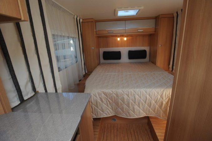 Pour la nuit, c’est une habitude chez Dethleffs : les lits permanents sont toujours grands. A preuve, le lit central du T 6857 mesure 2,10 m de long et 1,50 m de large ! Les couloirs de circulation sont également très larges. En revanche, l’implantation choisie peut gêner quelques utilisateurs. La situation de la cuisine et le plan de travail qui la prolonge empêchent de créer une vraie séparation avec la chambre. Par ailleurs, douche et cabinet de toilette sont regroupés. La dînette se transforme en lit simple, mais seul un petit enfant pourra vraiment y dormir.