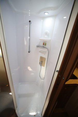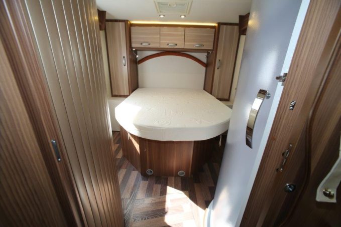 La belle chambre est complète. Le plancher y est laissé libre de toute entrave, excepté au seuil de la partie nuit. Le sommier révèle, une fois relevé, de très grands rangements et un accès à la soute. On apprécie la diversité des portes : à lattes en aluminium pour le cabinet de toilette, en méthacrylate de forme tonneau pour la douche, entièrement boisée et coulissante pour celle servant de séparation.