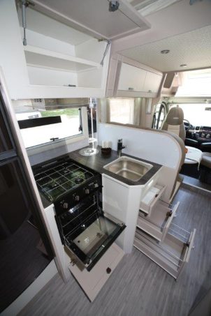 Dans ce profilé Progress Marbella, l'implantation avec lit à la française permet de gagner de la place dans la journée grâce à une astuce : la tête de lit relevable. De quoi faciliter l'entrée dans la chambre et à la cabine de douche. La disposition du lit de pavillon, au-dessus du salon, fait preuve d'autant de réflexion. Une fois descendu, grâce à la commande électrique intégrée, il ne gêne pas l'usage de la cuisine. A la nuit tombée, les éclairages à leds confèrent une ambiance agréable.