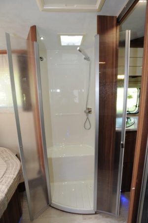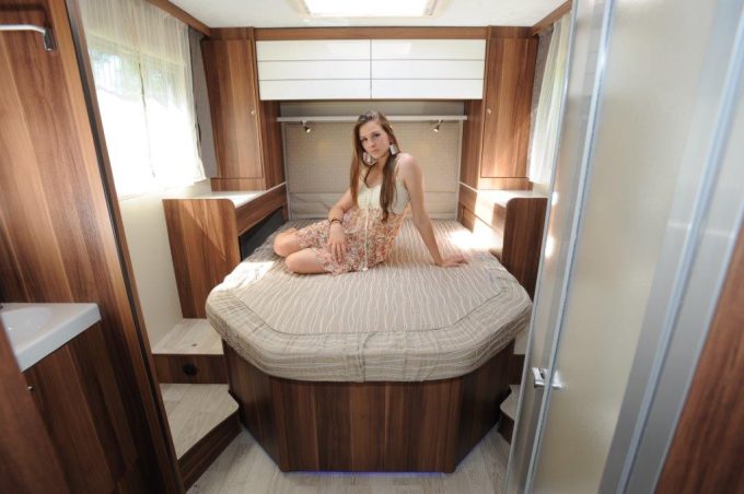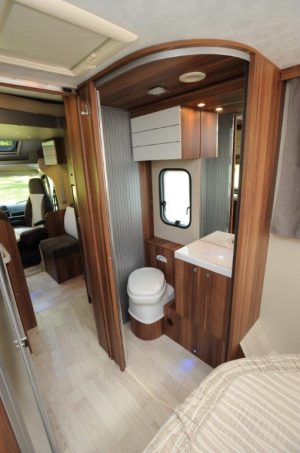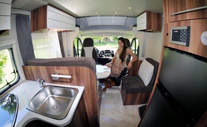 Dans ce modèle 265 TL, un très gros travail a été réalisé pour améliorer la cuisine. Le bloc est plus ergonomique et compte des rangements vastes et fonctionnels : deux grands tiroirs et un volume sous évier accepteront volontiers casseroles et conserves. Le bac de l’évier est, par ailleurs, convenablement proportionné pour y laver un fait-tout. Bon point aussi au meuble télé, pourvu d’un bras télescopique qui rend l’écran visible depuis le salon ou la chambre. Chauffage et eau chaude sont produits par le Combi 4. Nous aurions préféré un Combi plus puissant, vue l’ampleur de la cellule.