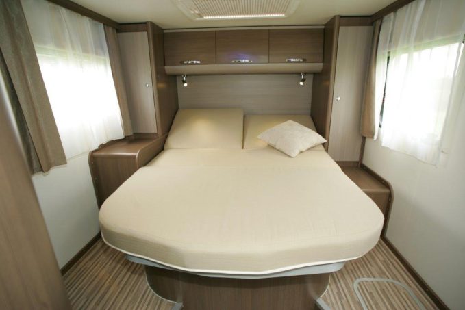 Dans la chambre, enfin, trône un grand lit central (198 x 140 cm) accessible par deux couloirs larges mais barrés d’une marche. La raison ? La hauteur du couchage permet de ménager un vrai garage. La dînette est convertible en lit d’appoint une place.