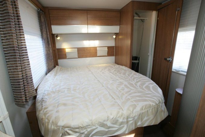 Ensuite, on découvre l’organisation intérieure… qui ne ressemble à rien de ce que l’on connaissait : le bloc-cuisine n’occupe plus le côté gauche, mais est positionné sur la paroi de droite (le réfrigérateur de 175 litres se situe en face) ; la penderie, elle, migre dans le cabinet de toilette, au-dessus des wc. Le salon et la chambre (avec lit de 145 x 190 cm) sont conventionnels. Notez qu’au dessus du salon, le lit de pavillon une personne est une option gratuite ; on le choisit ou pas à la commande.