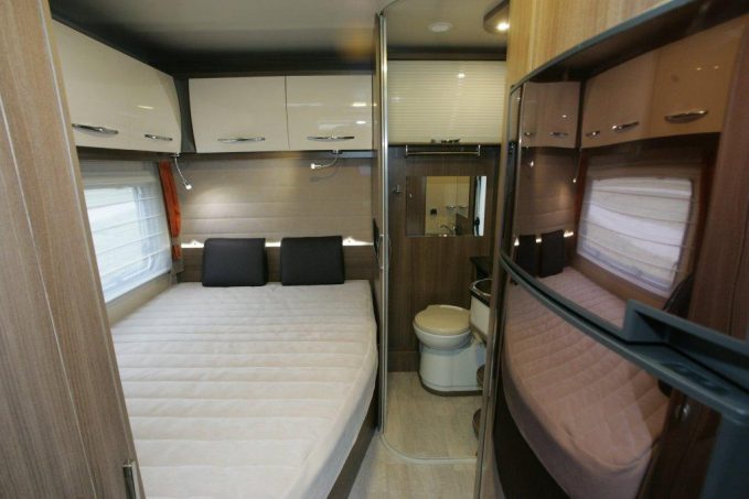 Le concept de l’agencement tient ici en peu de mots : profilé à lit de pavillon, de moins de 7 m, présentant un maxi-salon, une grande cuisine, un lit permanent (134 x 190 cm) et une salle d’eau en deux compartiments indépendants. D’où ce couchage à la française, accolé à la paroi (plutôt qu’un central décalé), avec la cabine de douche dressée au pied du lit. Le lit de pavillon (140/120 x 191 cm) s’abaisse manuellement. La hauteur sous plafond est suffisante pour ne pas souffrir de claustrophobie. Et en position basse, le lit n’interdit pas l’usage de la cuisine.